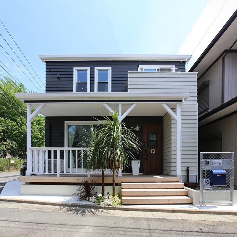 埼玉県上尾市K様邸の事例です。立体感のある黒いラップサイディングとカバードポーチが目を引く、サーファーズスタイルの住まいに仕上がっています。